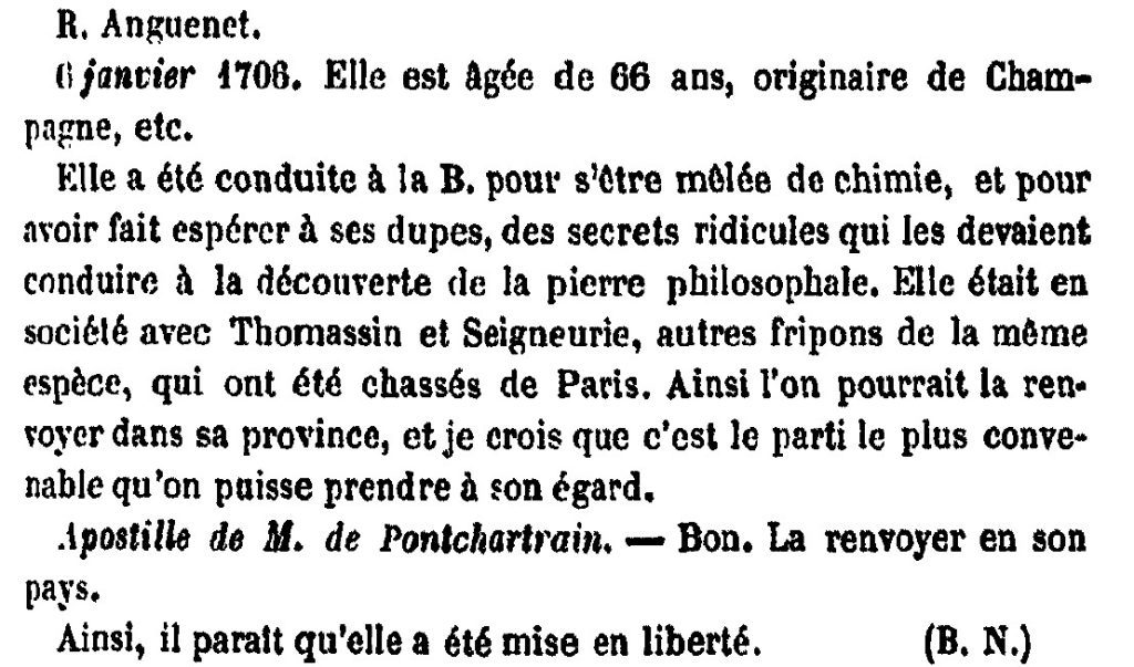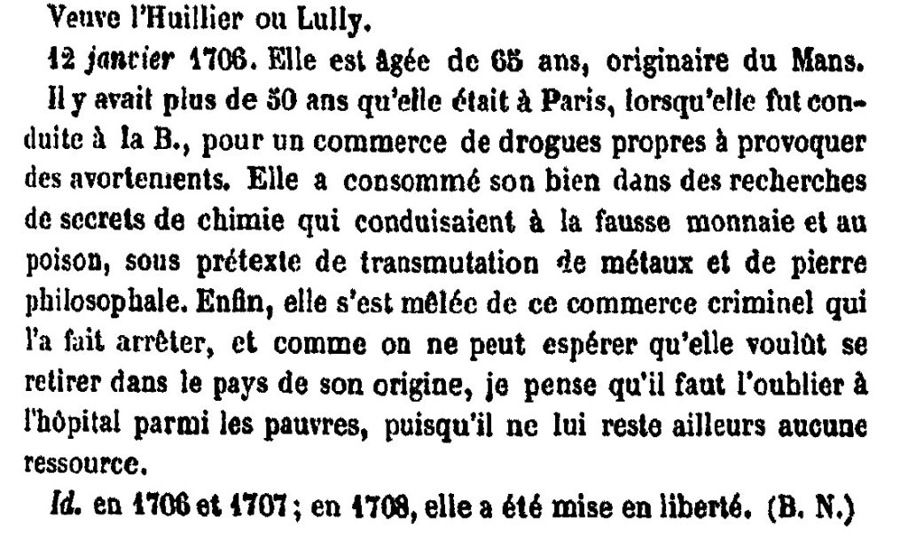 Il y avait plus de 50 ans qu’elle était à Paris, lorsqu’elle fut conduite à la B., pour un commerce de drogues propres à provoquer des avortements. Elle a consommé son bien dans des recherches de secrets de chimie qui conduisaient à la fausse monnaie et au poison, sous prétexte de transmutation de métaux et de pierre philosophale. Enfin, elle s’est mêlée de ce commerce criminel qui l’a fait arrêter, et comme on ne peut espérer qu’elle voulût se retirer dans le pays de son origine, je pense qu’il faut l’oublier à l’hôpital parmi les pauvres, puisqu’il ne lui reste ailleurs aucune ressource.
