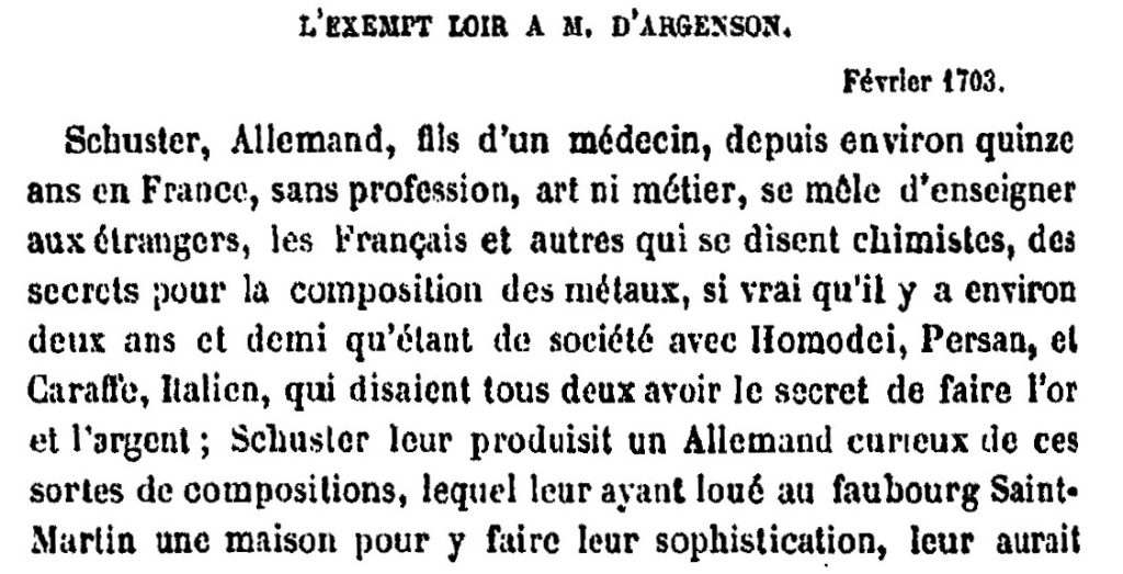 Schuster, Allemand, fils d’un médecin, depuis environ quinze ans en France, sans profession, art ni métier, se mêle d’enseigner aux étrangers, les Français et autres qui se disent chimistes, des secrets pour la composition des métaux, si vrai qu’il y a environ deux ans et demi qu’étant de société avec Homodei, Persan, et Caraffe, Italien, qui disaient tous deux avoir le secret de faire l’or et l’argent ; Schuster leur produisit un Allemand cinneux de ces sortes de compositions, lequel leur ayant loué au faubourg SaintMartin une maison pour y faire leur sophistication, leur aurait donné jusqu’à la somme de 6, 000 livres, dont Schuster eut sa part ; et Caraffe ne se croyant pas assez bien partagé, voulut tuer Homodei qui avait reçu le tout, ce qui, ayant fait découvrir la fourberie, l’Allemand vint les chercher pour se faire rendre son argent; il ne trouva plus que Schuster, qui dit n’avoir point l’argent, les autres étant évadés. Schuster est marié depuis quatre ans à une femme de mauvaise vie, et continue toujours à chercher des dupes. Schuster a été arrêté à la B.^ il y a environ cinq à six ans, soupçonné d’avoir intelligence avec les ennemis, oi!i il a resté un an.