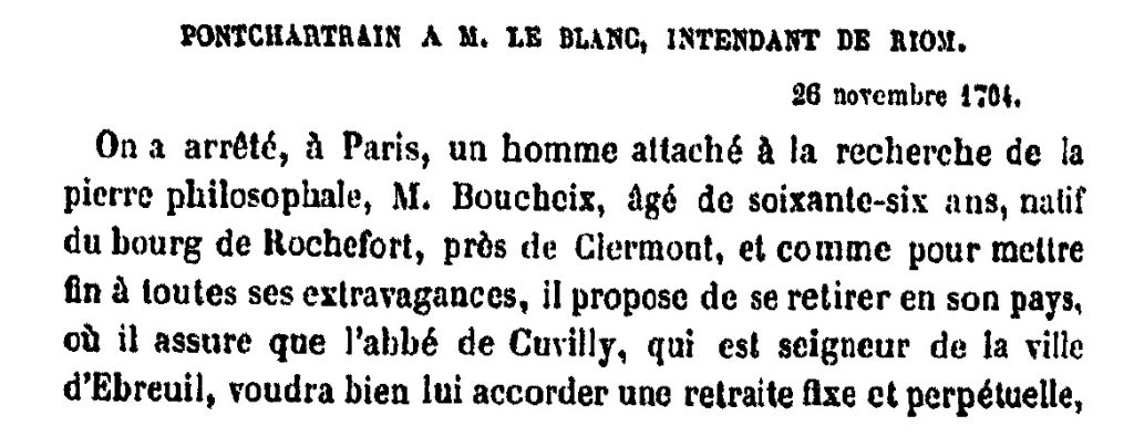 On a arrêté, à Paris, un homme attaché à la recherche de la pierre philosophale, M. Boucheix, âgé de soixante-six ans, natif du bourg de Rochefort, près de Clermont, et comme pour mettre fin à toutes ses extravagances, il propose de se retirer en son pays, où il assure que l’abbé de Cuvilly, qui est seigneur de la ville d’Ebreuil, voudra bien lui accorder une retraite fixe et perpétuelle, le Roi souhaite que vous vous informiez si effectivement on veut bien lui donner cet asile, afin qu’on puisse l’y envoyer; c’est ce que je vous prie de prendre la peine de me mander le plus tôt qu’il se pourra 10 décembre 1704.