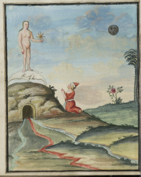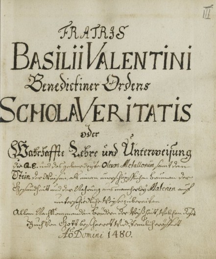 Veamos un ejemplo de este último caso. Lo hemos tomado del manuscrito de Ps.-Basilius Valentinus, Schola veritatis oder Wahrhaffte Lehre und Unterweisung. Este manuscrito está catalogado como Cod. alchim. 635 de la Biblioteca estatal y universitaria de Hamburgo y lo podemos consultar, ya que está digitalizado. Julian Paulus realizó una magnífica catalogación de los manuscritos alquímicos de dicha biblioteca entre 1990 y 1995, aún sin editar: Katalog der alchemischen Handschriften der Staats- und Universitätsbibliothek Hamburg. Y nos dice que dicho manuscrito, de 528 páginas (20 x 17) es de mediados del siglo XVIII y que contiene 17 dibujos de acuarela a página completa grapados en IIr, S. 19, 30, 99, 140, 231, 273, 276, 322, 348, 371, 390, 412, 427, 443, 465 y 490.