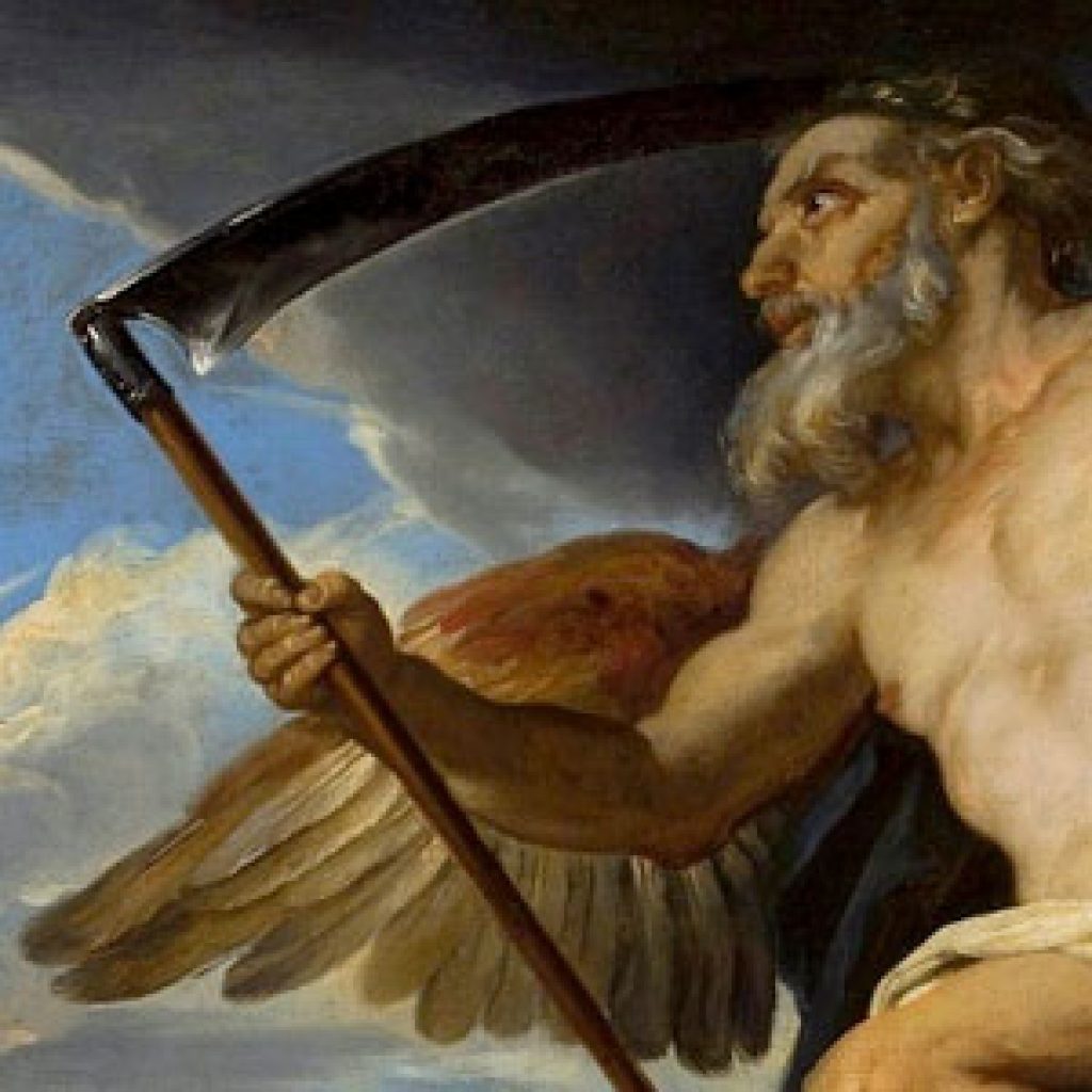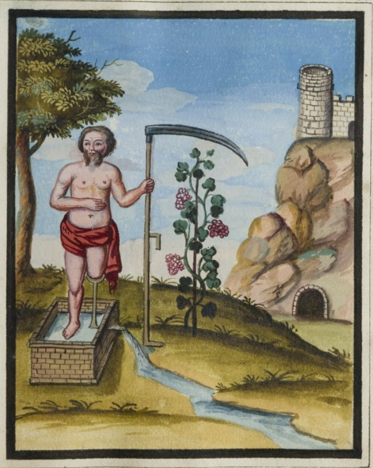 - Un hombre cojo y con barbas sujetando una guadaña y ligeramente vestido con una tela roja.