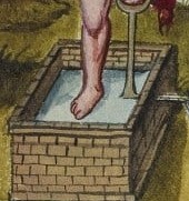 - El hombre está dentro de una pila de ladrillo llena la mitad o más. Pero hay que fijarse en un detalle muy importante. Si se aumenta la imagen podemos comprobar que no se hunde en el contenido de la pila, sino que está pisando (se ven los dedos de los pies) y el apoyo del cayado no penetra en el contenido de la pila. Esta señal nos indica claramente que está usando el acetato de plomo, que no es líquido, sino de aspecto salino, duro.