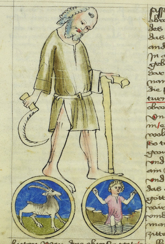 - El hombre cojo barbado sujetando una guadaña no es otro que Saturno. Así es como se le representa habitualmente. Se asocia con el plomo. Es decir: estamos partiendo del plomo. Pero no en su forma metálica, sino del óxido de plomo. Y esto lo sabemos por el color de la tela que le cubre la cintura. Podría ser de otro color, pero es roja, lo que indica que su estado es el óxido de plomo, también conocido como litargirio.