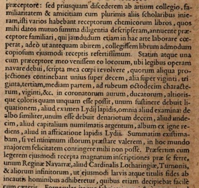 Recetas, digo, que no fueron entendidas, o casi totalmente despreciadas por todos vosotros, debido a la robustez de su estilo, que a veces también consideraban vanidoso, falso e imposible, compilado de una manera para simplemente engañarlos. Pero la mayoría es cierto, recogido no de la química vulgar trivial, sino de los mejores libros de los mejores adeptos, el tesoro de Diana. Recetas, digo, tan concatenadas y elaboradas por la congruencia, como la destreza maravillosa de los maestros, que cuando quitas o niegas a uno de ellos, no puedes sino rechazar todo lo demás como falso. Por el contrario, el que posee uno entre todos para ser cierto, debe tener fama de ser cierto todo lo demás; y en consecuencia reivindicar a los autores de ellos, nuestros maestros más venerados de toda la infamia de la mentira y la grosería