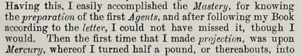 [16] Flamel, N., His Exposition of the Hieroglyphicall Figures which he caused to bee painted upon an Arch in St. Innocents Church-yard, in Paris. London, Printed by T. Snodham for T. Walkley at the Eagle and Child in Britans Bursse, 1624, 28: “Having this, I easily accomplished the Mastery, for knowing the preparation of the first Agents, and after following my Booke according to the letter, I could not have missed it, though I would. Then the first time that I made proiection…”