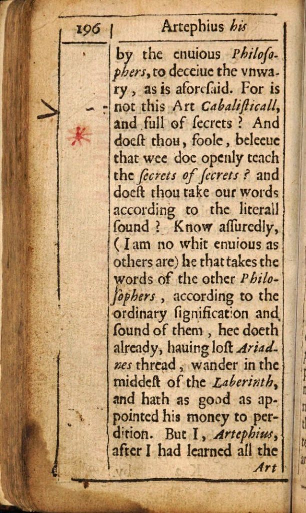 [7] Artefio, “Artephius his secret booke, of the blessed stone called the philosophers”, en Orandus, E. (trad.), Nicholas Flammel, His Exposition of the Hieroglyphicall Figures Which he Caused to Bee Painted Upon an Arch in St. Innocents Church-yard, in Paris; Together with the Secret Booke of Artephius, and the Epistle of Iohn Pontanus, Concerning Both the Theoricke and the Practicke of the Philosophers Stone, London, printed by T. Snodham for T. Walkley, 1624, 141-235. 196: “For is not this Art Cabalisticall, and full of secrets? […] as good as appointed his money to perdition”.