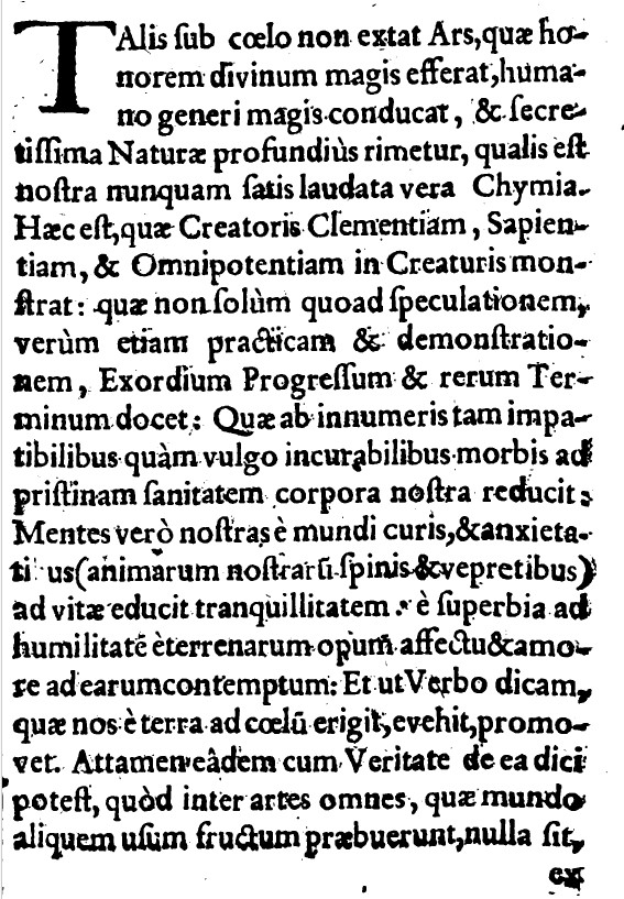 No hay bajo el cielo un arte más que promover el honor de Dios, conducir mejor a la Humanidad y buscar más estrechamente en los secretos más profundos de la Naturaleza, que nuestra verdadera y más que loable Alquimia. Esto es lo que muestra la clemencia, sabiduría y omnipotencia del Creador en las criaturas, que enseña no sólo la especulación, sino también la práctica y la demostración, el principio, el progreso y el fin de las cosas, que restaura nuestros cuerpos de las infinitas enfermedades, como por los medios comunes intolerables para la salud prístina, y desvía nuestras mentes de los cuidados y las ansiedades del mundo (las espinas y zarzas de nuestras almas) a la tranquilidad de la vida, del orgullo a la humildad, del amor y el deseo de la riqueza mundana al desprecio del mismo. Y en una palabra: que nos eleva de la tierra al cielo. Sin embargo, a pesar de todo lo que podamos decir con la misma verdad, que entre todas las artes que han producido algún beneficio o beneficio para el mundo, no hay ninguna por la cual hasta ahora se haya otorgado menos honor a Dios Todopoderoso, y menos utilidad para la Humanidad; para que una ciencia de tan alta dignidad y utilidad sea demasiado común, o mal administrada por ignorantes e impíos, los poseedores prudentes de la misma hicieron su oficio para describirla, para darla a conocer sólo a sus discípulos, para excluir por completo a los indignos. Pero con el paso del tiempo, los adeptos que llegaron a una mayor perfección de conocimiento y experiencia, inventaron a veces uno, a veces otro método más corto en su trabajo, alterando hornos, fuegos, vasos, pesos, incluso la materia misma; quienes, por tanto, también se vieron obligados a hacer nuevas teorías y términos del arte, de acuerdo con la nueva práctica inventada, sucediendo que el estudioso de un adepto no entendió la nueva teoría, y mucho menos la práctica de otro; lo que a veces también les sucedió a los propios adeptos, especialmente a aquellos que estaban bajo el documento de cierto patrón en algún método y proceso en particular; ya que no tenían el poder de discernir más allá de lo que habían aprendido; con lo cual generalmente recelaban de todas las ideas de otros hombres, especialmente aquellas que diferían de las suyas, aunque en sí mismas buenas y correctas, como falaces y contrarias a la naturaleza, o aplicaban otras teorías, frases y términos del arte para hombres desconocidos para ellos; procesos particulares con el que estaban familiarizados, como lo declararé en muchos ejemplos en otros lugares; por lo que ellos mismos volvieron este arte en un caos tan oscuro, que hasta ahora ni los maestros ni los estudiosos han podido comunicar ningún beneficio al mundo instruido. Es de maravillarse, aunque más bien lamentarse, ver tales sistemas filosóficos tan imperfectos, como los que los maestros de este arte nos han legado hasta ahora, que rara vez contradicen tanto a la Naturaleza como a ellos mismos, mientras que los milagros de la Naturaleza podrían, por virtud de este arte, ser expresados verdadera y llanamente sin ninguna convulsión o contracción de las palabras dichas. A este respecto me atrevo, con licencia filosófica, afirmar aquí que la mayoría de los adeptos se han declarado al mundo en sus escritos mejores químicos que filósofos. Por lo que pido: ¿podrían haberlo hecho mejor en Medicina, que haberse aplicado a este tema, imitando la diligencia y la industria de Paracelso? ¡Pero ay! Entre todos, encuentro quizás tres o cuatro que han sido cuidadosos y accesibles aquí; y, por lo tanto, lo peor es que este noble y necesario arte no haya progresado más, que sea manifestante de la química común, donde se mencionan los nombres de las medicinas famosas, siendo ellos mismos desconocidos, y dando las conchas para los granos. Últimamente, no solo teníamos esperanza, sino también promesas de la Fraternidad Rosacruz, como si tuvieran la intención de hacer que nuestra era fuera más feliz con sus estudios; pero hasta ahora no se ha escuchado ningún efecto, no podemos dejar de temer que sus justas promesas nunca se cumplirán.