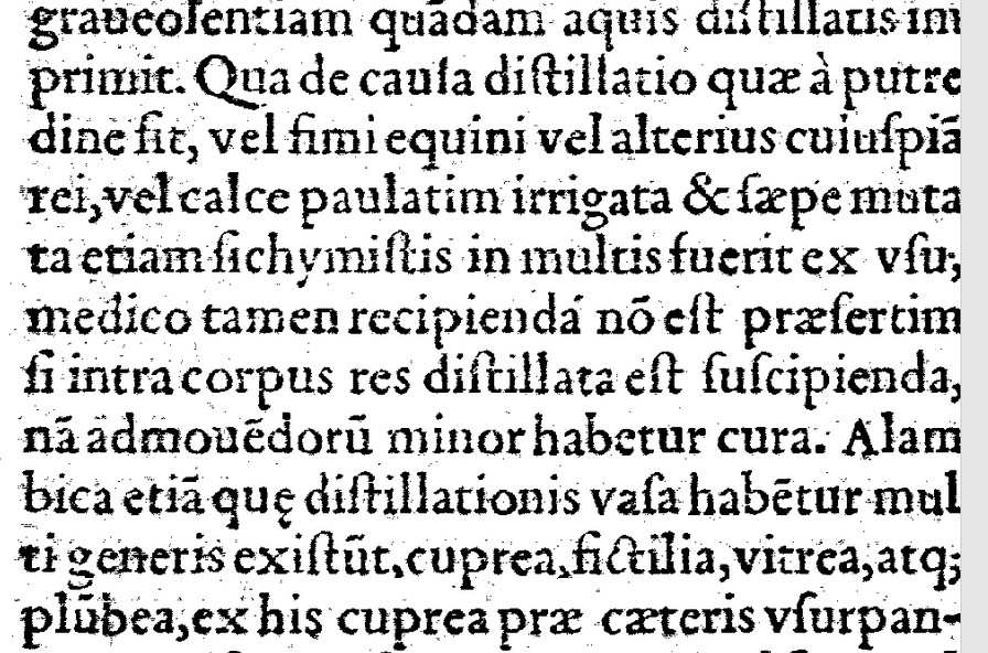 «Ignis destillationibus convenient. Qua de causa distillatio quae a putredine sit, vel simi equini vel alterius cuius piâ rei vel calce paulitim irrigata & saepe muta etiam si chymistis in multis fuerit ex usu medico tamen recibenda nô est praeservatis si intra corpus res distillata est suscipiendi nâ admovêdorû mima (milma) habetur cura. Alambica atiâ quae distillationes vasa habêtur multi generis existût, cuprea, sicticia, vitrea, atq plûbea.»