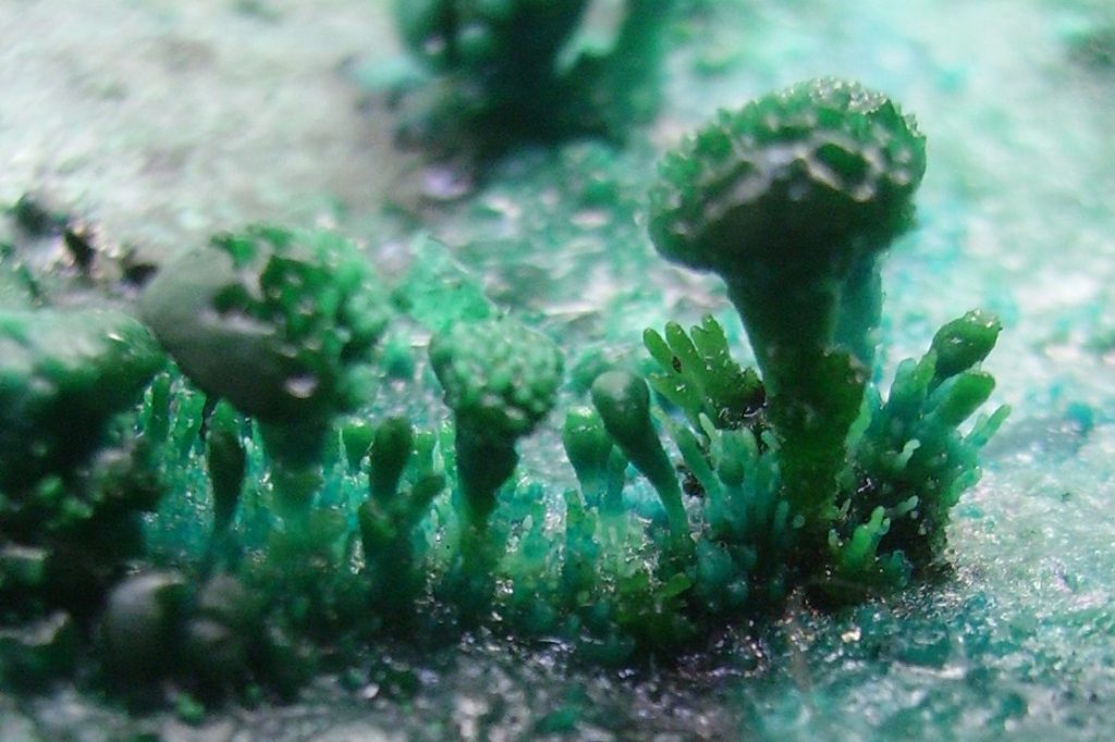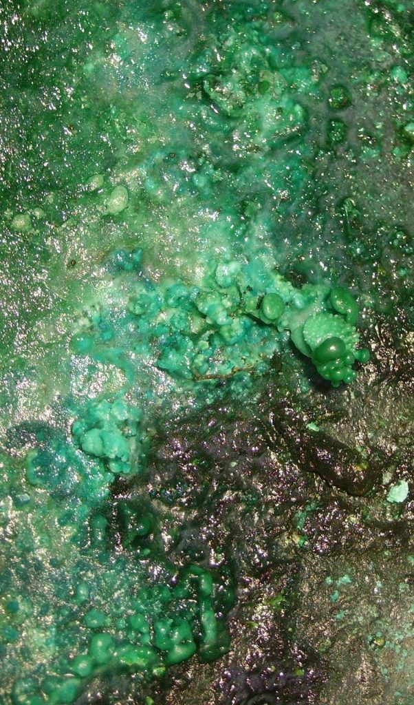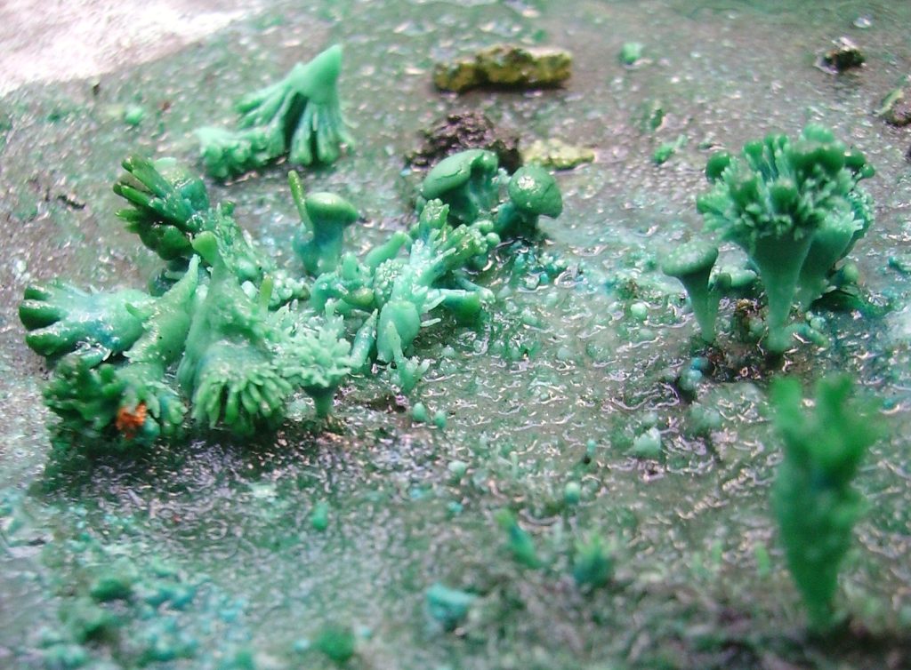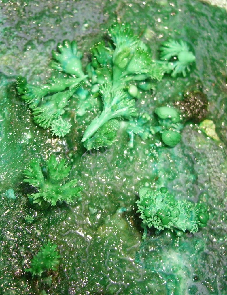 Hoy me he llevado una sorpresa muy agradable. Había dejado una vieja caldera de cobre de las de la matanza a medio limpiar, con una solución de vinagre y sal gorda en el fondo, que estaba lleno de grasa. Al cabo de bastantes días vuelvo a la faena y me encuentro estos fascinantes cristales de aspecto arboriforme fractal y otros también con formas bulbosas, de hongos, etc.. El vinagre, como sabéis, es un ácido: ácido acético, que al combinarse con el cobre produce el compuesto de color verde, que se llama acetato de cobre o acetato cúprico. Algunas formas, como las burbujas, son típicas de los cristales de sal común, que también toman formas coraloides, pero no he encontrado imágenes de cristales de sal que recuerden a esos árboles. No sé cuál es el papel de la grasa, si es que ha tenido alguno en la construcción de estas formas. Estos cristales son muy blandos y se deshacen inmediatamente con sólo rozarlos.