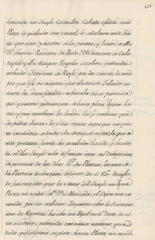Aún no nos desengañamos ni perdemos la esperanza de hallar en esta era la piedra philosophal, que la buscaron tantos sin toparla, porque se oye a todos los que afirman que saben hacer oro y plata. Y últimamente habiendo un fraile carmelita calzado ofrecido hacer plata de cualquier otro metal, le señalaron una junta que viese y asistiese a la prueba, y fueron de ella Don Lorenzo Ramírez de Prado, don Francisco de Calatayud y el Marqués Virgilio Malvezzi, quedando excluido Francisco de Rioja por dos causas, la una porque dixo en ocasión que el mocito irlandés intentó los meses pasados hacerla en su presencia, que cuantos presumían de hacer plata eran locos, y que también lo eran los que creían que se podría hacer. La otra causa es porque no quiere concurrir a donde el Marqués entra. Lo que de esta postrera junta ha resultado, ha sido que habiendo el dicho fraile hecho diferentes veces sus diligencias en presencia de los dichos señores, dos plateros los más antiguos de la platería declararon delante de S.E. debajo de juramento que la masa del fraile no era plata ni nada.