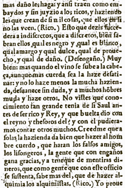 “y ansi traen como embaydos y sin juycio a los ricos, haziendo que les crean de sí mil cosas, que ellos en si no las veen. (Rico.) Esto que dezis succederá alos indiscretos, que a discretos, bien sabrán ellos qual es negro y qual es blanco, qual amargo y qual dulce, qual de provecho y qual de daño. Muy bien: mas quando el vino se sube a la cabeça, aunque mas cuerda sea la haze desatinar: y no lo haze menos la mucha hazienda, desvanece sin duda, y a muchos hombres muda y haze otros. No vistes que conocimiento tan grande tenia de si Saul antes de ser rico y Rey, y que buelta dio con el reyno y thesoros del? y con el pudieramos contar otros muchos. Creedme que a solas la hazienda da bien que hazer al hombre cuerdo, que haran los falsos amigos, los lisongeros, la gente que con engaños gana gracias, y a trueque de mentiras dineros, que como gente que con este officio se sustenta, sabe más del, que de hazer alquimia los alquimistas.”