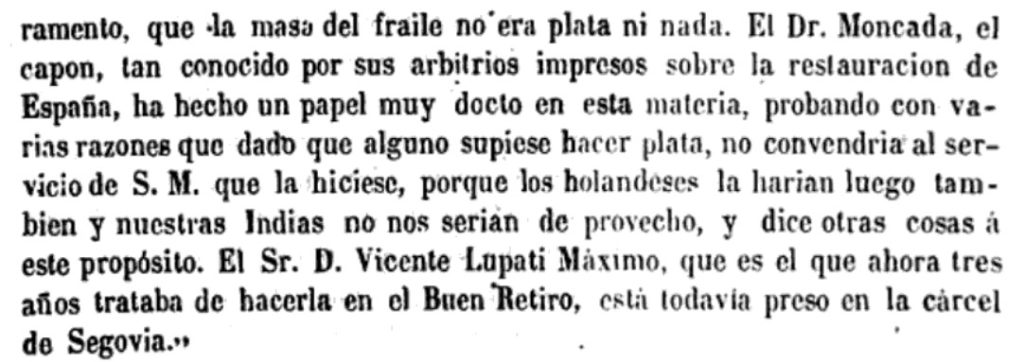 Sobre la carta de Francisco de Vilches: Memorial histórico español, tomo XIII, Madrid, Imprenta real, 1861, 117, carta de Madrid, diciembre 19 de 1634, Francisco de Vilches al P. Rafael Pereyra. (Tom. 216, Fol. 205): Estos días pasados sucedió que un extranjero se levantó, como suele decirse, con el santo y la limosna. Entró en el servicio de S.M. por artífice de plata, diciendo que sabía hacerla de cosas muy viles. Estaba en el Buen Retiro disponiendo lo necesario, y al mejor tiempo huyó llevándose dos mil ducados. Fueron muchos en su seguimiento, y finalmente le alcanzaron. Dicen que es hechura del Protonotario, con que tendrá favor. Sobre la ermita de San Sebastián, en el Buen Retiro, así lo escribió Bernardo Monanni (1597-1647), secretario residente de la legación de Toscana en Madrid. Archivio di Stato di Firenze, filza 4965, carta de Monanni al Gran Duque de Toscaza, 4-11-1634. Sobre un vergel clásico del Barroco: Carl Justi, Diego Velazquez und sein jahrhundert, Bonn, Friedrich Cohen, 1922. 351. Reedición y traducción: Carl Justi, Velázquez y su siglo, Ediciones AKAL, 1999. Alfonso Rodríguez G. de Ceballos, “Velázquez y las ermitas del Buen Retiro: entre el eremitismo religioso y el refinamiento cortesano”, Atrio, 15-16 (2009-2010), 135-148. Noviembre de 1636: Noticias de Madrid, 29 de noviembre de 1636, B.N. 1/41117, 63: “A don Vicencio Lupati, que es aquel embustero que ha dos años que ofrecía hacer plata, después de tan larga prisión, le han dado oidos de nuevo y le han llevado al Alcázar de Segovia, donde dicen que hace plata y que la ha hecho.”. Noticia recogida por Antonio Rodríguez Villa (Madrid, 1843- id., 1912) en La Corte y Monarquía de España en los años 1636‑37, Madrid, Luis Navarro, 1886, 68. 7 de noviembre de 1637: “El señor don Vicente Lupati Máximo, que es el que ahora hace tres años trataba de hacerla en el Buen Retiro, está todavía preso en la cárcel de Segovia”, en Rodríguez Villa, 215. Sobre el agua fuerte: Marañón, G., El Conde-Duque de Olivares. La pasión de mandar, Madrid, Espasa-Calpe, 1992, 96. Hace aquí una extraña cita nuestro famoso médico e historiador que no hemos sido capaces de contrastar. Cuando da las noticias sobre Lupati remite en dos ocasiones al texto de Rodríguez Villa y una tercera al texto de Josef Çarroca, Política del Comte de Olivares. Contrapolitica de Cathaluña y Barcelona. Contraveri al veri que perdía lo Principal Cátala. Veritates brevement assengaladas. Proteccio manifestada desl Sants Auxiliares, etc., Barcelona, 1641, XIV-27. Pero lo cierto es que esta obra, de ochenta páginas no está paginada y no hemos encontrado la referencia en ninguna de las cuatro ediciones consultadas: Bayerische Staatsbibliotek, 4 Hisp 14 w; BNM R/5714 (1); BNM, VE 178/3, BNM, 2-48359. Hay que añadir, que, temiendo ser una errata, también hemos consultado todas las ediciones del texto de Gregorio Marañón, sin que hayamos podido verificar que sea una errata. Sobre la esperanza del oro: Memorial histórico español, tomo XIV, Madrid, Imprenta real, 1862, 21 a 28, carta de Madrid, enero 27 de 1637 (Tom. 99, Fols. 136 y 137): “De Segovia escriben que el hombre que tenían preso en el alcázar, con las aguas fuertes que daban para hacer oro, se ha hecho muchas llagas maliciosamente, con que se ha visto que es un embelecador, y por orden del Consejo ha sido llevado ala cárcel donde se procederá contra él. Ha hecho grande gasto, pues fuera de los materiales que le daban, estaba, dicen, aguardando a un secretario del Rey que había de ira verle, y le regalaban mucho con las esperanzas del oro. Sebastián González, al P. Rafael Pereyra, de la Compañía de Jesús.” Sobre Azorín: Azorín, La fuerza del amor, La España editorial, 1909 (or.: 1901), 112: DOÑA MARÍA. — A bien que si D. Vicencio Lupati saliera adelante con la invención de hacer plata, ya se había todo remediado.