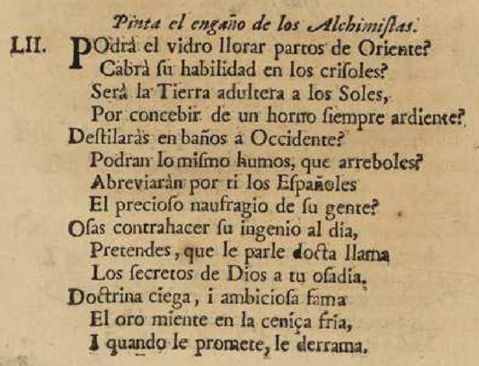 ¿Podrá el vidro llorar partos de Oriente? ¿Cabrá su habilidad en los crisoles? ¿Será la Tierra adúltera a los Soles, Por concebir de un horno siempre ardiente? ¿Destilarás en baños a Occidente? ¿Podrán lo mismo humos que arreboles? ¿Abreviarán por ti los Españoles El precioso naufragio de su gente? Osas contrahacer su ingenio al día; Pretendes que le parle docta llama Los secretos de Dios a tu osadía. Doctrina ciega y ambiciosa fama: El oro miente en la ceniza fría, Y cuando le promete, le derrama.5