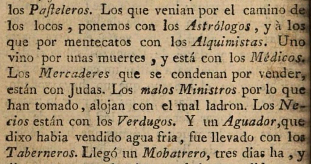 “Los que venían por el camino de los locos ponemos con los astrólogos, y a los por mentecatos con los alquimistas. Uno vino por unas muertes y está con los médicos. Los mercaderes, que se condenan por vender, están con Judas. Los malos ministros, por lo que han tomado, alojan con el mal ladrón. Los necios están con los verdugos. Y un aguador que dijo que había vendido agua fría, fue llevado con los taberneros.”13