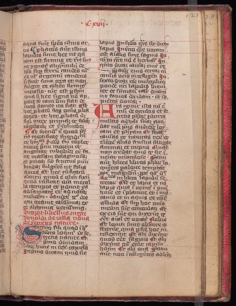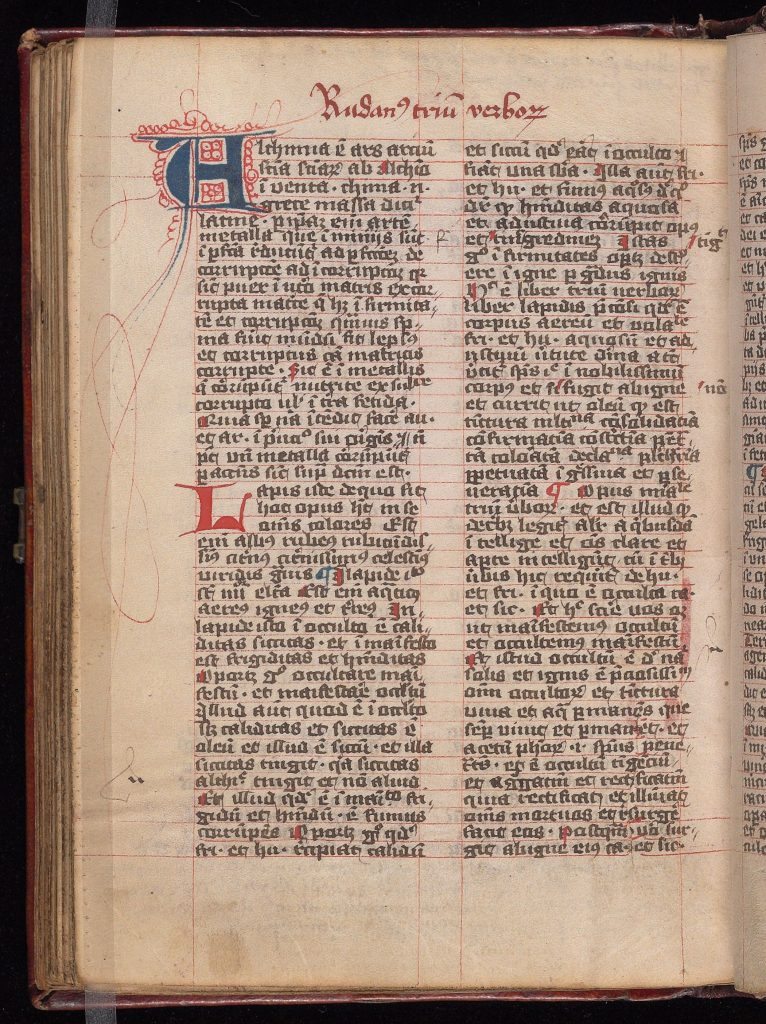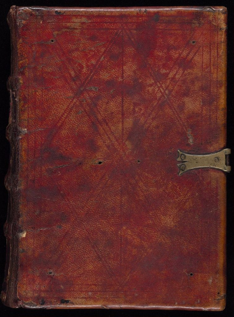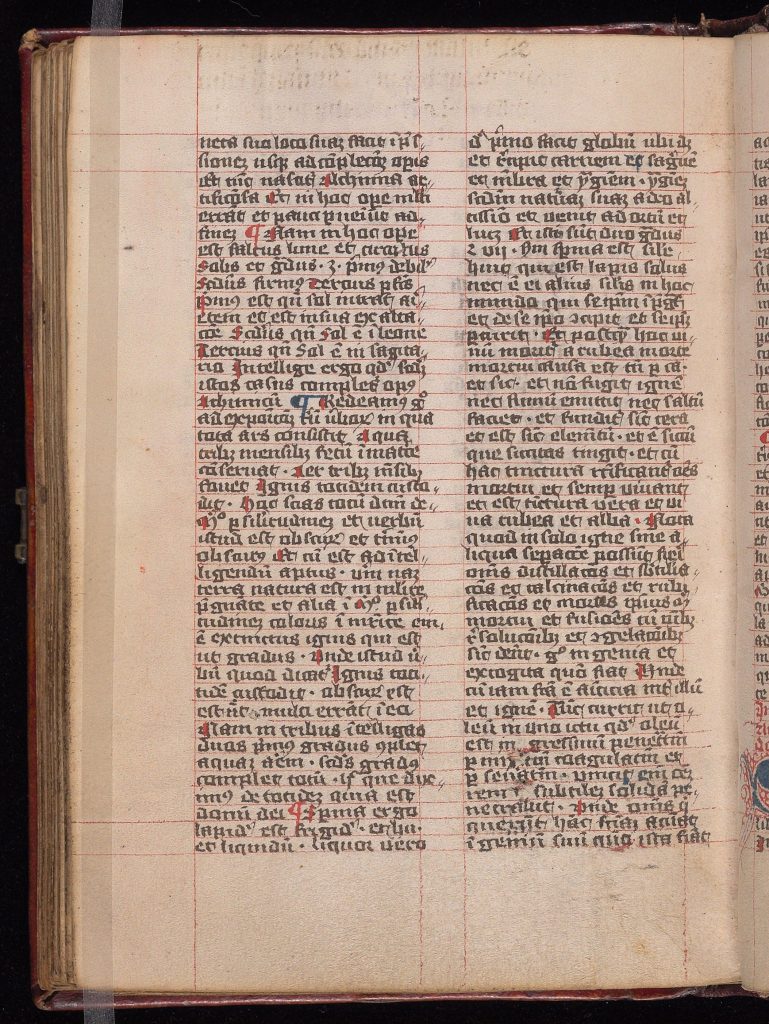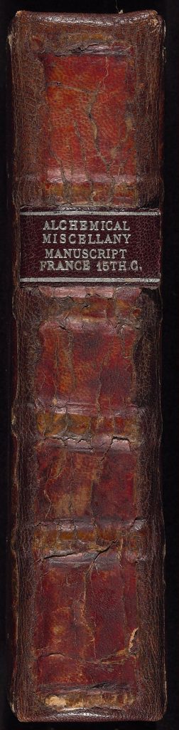ENCUADERNACIÓN: Encuadernación germánica del siglo XV, presumiblemente original, de tablas de roble cubiertas con piel teñida de rojo, lados enmarcados por triple persiana de filetes, filetes adicionales dibujados en diagonal para formar un patrón romboidal; el respaldo original colocado sobre un nuevo respaldo conservando los cuatro originales con bandas elevadas, además de bandas para la cabeza y los pies, que se introducen en las tablas, sujeta con cuñas de madera y reforzada con tiras de pergamino (cortadas de un manuscrito del siglo XIII con escritura débil en un tamaño muy pequeño a mano gótica) que se pegan a las tablas interiores. En ambas portadas hay orificios para clavos cerca de las esquinas y dos de estos orificios en el centro de cada cubierta que indican la retirada de esquineros y centros de mesa de latón. En la parte superior se conserva un pestillo con barra de hierro, sujeto por tres clavos de latón. Falta el cierre de la tapa inferior indicado sólo por una marca. Moderna etiqueta de cuero en la tira trasera, estampada en plata entre las reglas superiores y abajo: «ALCHEMICAL | MISCELLANY | MANUSCRIPT | FRANCE 15TH C.»