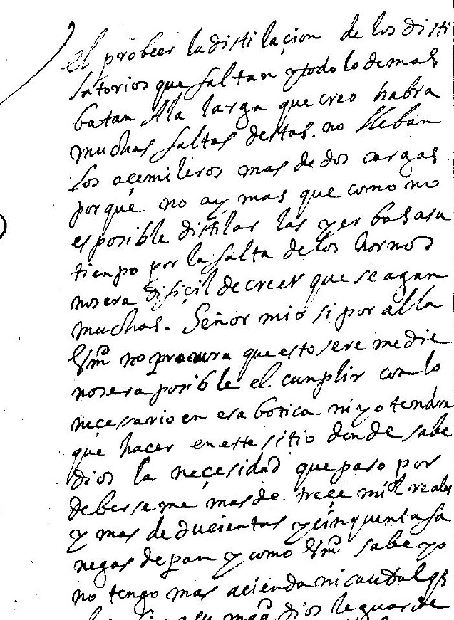 «El probeer la distilacion de los distilatorios que faltan y todo lo demas batan a la larga que creo que habra muchas faltas destas. no lleban los açemileros mas de dos cargas porque no ay mas que como no es posible distilar las yerbas a su tiempo por la falta de los hornos era difiçil de creer que se agan muchas. Señor mio si por alla Vmd no procura que esto se remedie no sera posible cumplir con lo neçessario en esa botica ni yo tendre que hacer en este sitio donde sabe Dios la neçesidad que paso por deberseme mas de treçe mil reales y mas de ducientos y cinquenta fanegas de pan…»